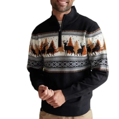Upgrade your winter knitwear with this black fairisle quarter zip jumper. Stylish high neck with quarter zip Fashioned with a reindeer fairislae print across the chest and arms