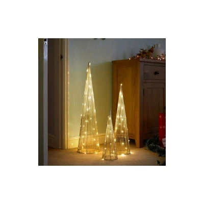 General description Our Traditional Gold Light Up Tree Set includes three stunning light-up trees that create a warm, festive atmosphere in your home. These battery-operated decorations feature 90 LEDs per set, providing a beautiful golden glow that enhances any indoor space. Perfect for Christmas and other celebrations, these trees add a touch of elegance and charm to your decor. Technical specifications Number of LEDs: 90 per set Battery requirement: 8 x AA batteries (not included) Dimensions: (S) 40 cm, (M) 60 cm, (L) 80 cm (approx) Usage Ideal for indoor use only Perfect for table centerpieces, sideboards, shelving, mantelpieces, windowsills, or children's room decor Can be used during Christmas and for entertaining or parties Other information Features an automatic timer: 4 hours on and 20 hours off Crafted from durable cotton effect material for long-lasting service Mess-free decoration with no need for electrics or wires