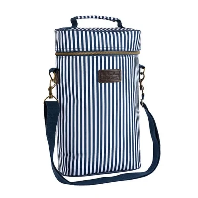 The Three Rivers 2 Bottle Carrier is ideal for the warmer weather to ensure you stay hydrated as well as cooling you down. With generous insulating, this bottle cooler will keep your drinks cold and fresh for longer, perfect for taking with you on a picnic or a hike.It has a lovely navy and white striped design, perfect for the summer season. Inside, it is lined with white PEVA for easy cleaning and protection against spillages. It is finished with an adjustable handle so you can carry it on your shoulder or in your hand, plus a handle on the lid and a zip fastening around the top.Dimensions: 34 (H) x 20 (W) x 10 (D) cm.Polyester outer with PEVA lining.