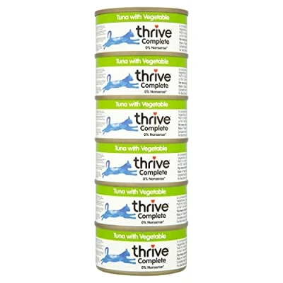 Complete Tuna Fillet & Vegetables Wet Cat Food Fish flavour gently steamed in fish broth with vitamins, minerals & a splash of sunflower oil to ensure your cat has the right amount of fat & nutrients to thrive. Cat food tuna & veg made in a factory for human food & packed by hand 100% Thrive 0% Nonsense No Artificial Flavours, No Additives, No Colourings, No Preservatives, No Fillers, No Thickeners, No Added Sugar, No Gluten, No Wheat. Thrive promotes great pet health by providing a pure natural healthy menu Delicious premium-quality fish. Freshly caught tuna, caught using dolphin-safe methods Gently cooked with vegetables to preserve the true taste. In practical, single portion-sized cat food tins. Thrive kitten food also available. Cat Food Tins: We supply the very best high-quality wet cat food fish rather than non-recyclable gourmet cat food pouches. Wet cat food fish that will get your cats applaws and get them to come back for an encore. Who are THRIVE? A cat & dog-loving no-nonsense business. For over 24years Thrive have been making great-tasting healthy food & treats with quality ingredients for pet owners who have sweet dreamies knowing they have given their pet the very best!