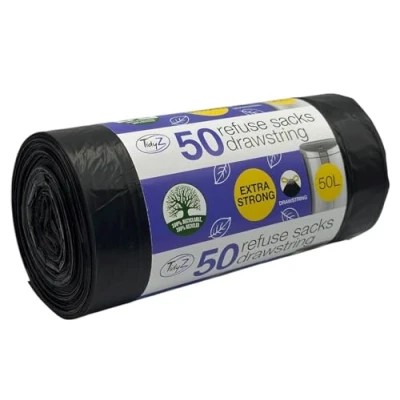 EXTRA STRONG & TEAR RESISTANT - Premium quality 50 litre black bin bags designed with reinforced material to handle heavy waste without splitting or tearing. Perfect for kitchen waste, garden refuse, and general household rubbish. DRAWSTRING CLOSURE FOR EASY HANDLING - Convenient drawstring design makes tying and carrying full bags effortless. No more struggling with knots - simply pull the strings tight and lift. Ideal for wheelie bins and pedal bins. 100% LEAK PROOF PROTECTION - Advanced seal technology prevents unpleasant leaks and drips, keeping your bins clean and odour-free. Durable construction holds up to 50L of waste safely. ECO-FRIENDLY RECYCLED PLASTIC - Made from 100% recyclable and recycled materials, helping you reduce environmental impact without compromising on strength. Responsible choice for environmentally conscious households. GREAT VALUE 50 BAGS ON ROLL - Convenient roll format for easy storage and dispensing. Each pack contains 50 individual bags, providing excellent value for money and lasting supply for busy households. Perfect for a Variety of Household Uses; Kitchen Waste, General Waste Collection, Office Bins, Commercial Waste Bins, Spring Clean, Organising, Mega Value