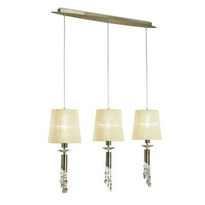The Tiffany Linear Pendant offers a stylish design in antique brass with cream shades. With three lights and clear K9 crystal, it provides sophisticated lighting that enhances your dining space's elegance and warmth.