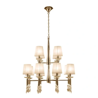 The Tiffany Pendant 2 Tier showcases 12 lights in exquisite French gold. Its cream shades and clear crystal accents offer a refined look, perfect for adding a touch of luxury to your room.