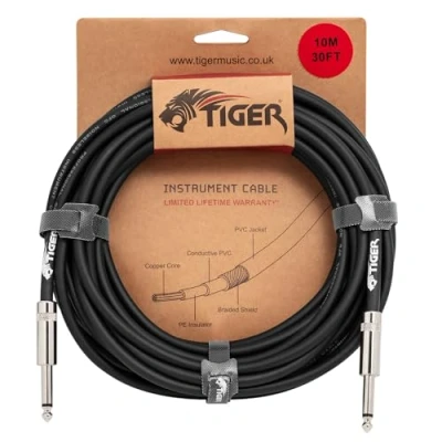 Tiger 10m (33ft) Guitar Instrument Cable 1/4 Mono Jack to Lead, Copper Connectors, Shielded Low Noise for Electric Guitar, Bass, Keyboard, Amp