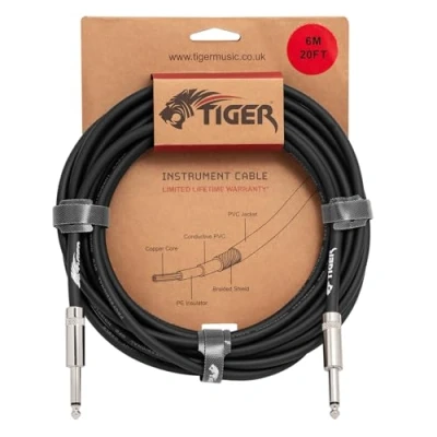 Tiger 6m (20ft) Guitar Instrument Cable 1/4 Mono Jack to Lead, Copper Connectors, Shielded Low Noise for Electric Guitar, Bass, Keyboard, Amp
