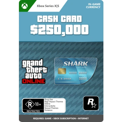 Purchase the Tiger Shark Cash Card (Xbox Series X|S) to gain GTA$250,000 to spend in the Xbox One version of GTA Online. Cash is king in this town. Solve your money problems and help get what you want across Los Santos and Blaine County with the purchase of cash packs for Grand Theft Auto Online. All purchased cash is automatically deposited into your character’s bank account. Spend wisely, cash therapy is fleeting.