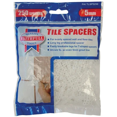 General description The Faithfull Long Leg Tile Spacers are designed for precise and easy tiling applications. They help maintain consistent gaps between tiles, ensuring a professional finish. These versatile spacers can be easily snapped when creating T-joints and removed once the adhesive has set. Technical specifications Size: 5mm Pack quantity: 250 pieces MPN: 5-250 EAN: 5023969301280 Compatibility and accessories Compatible with most tile types and adhesives Use with standard tile adhesives and notched spreaders Installation Apply tile adhesive with a notched edge spreader Place one spacer at each corner of the tile Add additional spacers as you lay each new tile Ensure spacers are used consistently during the tiling process Leave tiles to set for at least 24 hours before grouting Remove spacers once the adhesive has fully set Usage Maintain even gaps between tiles for a professional finish Suitable for wall and floor tiling Can be snapped to create T-joints Other information