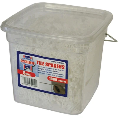 General description The Faithfull Long Leg Tile Spacers are designed for precise and easy tiling. They help maintain consistent grout lines and can be easily snapped for T-joints. These versatile spacers are removable once the adhesive has set, ensuring a clean finish. Technical specifications Size: 5mm Pack quantity: 1,000 units in a tub MPN: 5-1000 EAN: 5023969301303 Installation Apply adhesive with a notched edge spreader and press tiles firmly into place. Place one spacer at each corner of the tile and add more as needed for even spacing. Ensure tiles are aligned and evenly spaced using the same brand and product code for consistency. Allow tiles to set for 24 hours before grouting. Remove spacers after adhesive has fully set for a clean finish. Usage Use to maintain uniform grout lines during wall or floor tiling. Snip spacers for T-joint applications if needed. Other information Note: Spacer dimensions may vary slightly from stated size. Always use the same brand and product