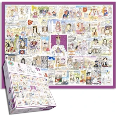 "The Crown" Jigsaw Puzzle by Tim Bulmer offers a royal-themed and entertaining experience for enthusiasts of monarch history. This jigsaw puzzle provides a fascinating journey through the historic lineage of English monarchs, starting with Edward the Confessor in 1042 and continuing up to King Charles III. Tim Bulmer's illustration captures the essence of each monarch, complemented by intriguing facts, such as King Steven's cousin Matilda's disruptive role in his reign. Tim Bulmer's illustration captures the essence of each monarch, complemented by intriguing facts, such as King Steven's cousin Matilda's disruptive role in his reign. Tim Bulmer's witty and humorous artistic style brings a light-hearted and amusing touch to this royal jigsaw puzzle, making it an enjoyable and educational experience for history enthusiasts., Manufacturer: All Jigsaw Puzzles