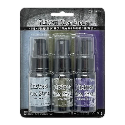Tim Holtz Distress Halloween Mica Stain Set #6 Add colorful pearlescent shimmer to your mixed media and paper craft projects. The Distress Mica Stains are translucent pearlescent sprays that add color and shimmer to paper, canvas, wood, fabric, and other porous surfaces. Use as a finishing spray or layer over inks and paints to create luminous effects and backgrounds. This set contains: PHANTOM MIST, SPECIMEN and OMINOUS TWILIGHT.