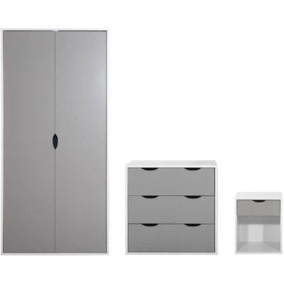 Timber Art Design UK Alton 3 Piece Bedroom Furniture Set Includes 1 Wardrobe, Drawer Chest & Bedside Storage Cabinet Organiser Unit With Pull Out Handles For Modern White Grey