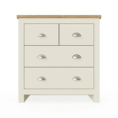 Full of presence, the Lisbon range in Cream and cascading Oak tops fills any room with warmth and comfort. A beautiful stylish chest with 4 drawers, in Cream with brushed steel handles which will bring a touch of class to any room. The diversity of drawer sizes makes it easy to organise and store items regardless of their size. Cream Frames with Contrasting Oak Effect Top. Manufactured using particle board, each item comes flat packed for self-assembly at home, Lisbon Furniture Collection. MEASURES - H 82cm x W 79cm x D 35cm. Easy to Use: These drawers are equipped with metal rails, which visually coordinate with the main body and functionally ensure smooth opening and closing, which is convenient for daily access to items. AMPLE STORAGE - Great option for small spaces. Its neutral finish will allow it to blend in with different decor. Our chest of drawer can be used in the living room, room or home office. VERSATILE - Our cream and oak furniture has stylish metal handles that is not only suitable for bedroom use but can be used anywhere you need to store clothes, toys and other everyday object in your home or office. MADE OF ENGINEERED WOOD - Each item comes flat packed for self-assembly at home. Please note that due to lighting and different devices you might be using, the colour in the image may vary slightly for the actual colour of the product.