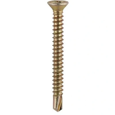 General description These TIMco 3.9 x 38mm Self Drilling PVC CSK Screws are designed for versatile applications, allowing for the fitting of various hardware to frames that include steel or aluminum reinforcement. The self-tapping thread and self-drilling point ensure easy installation and secure fastening. Technical specifications Size: 3.9 x 38mm Bit size: PH2 Colour: Zinc & Yellow Box Quantity: 1000