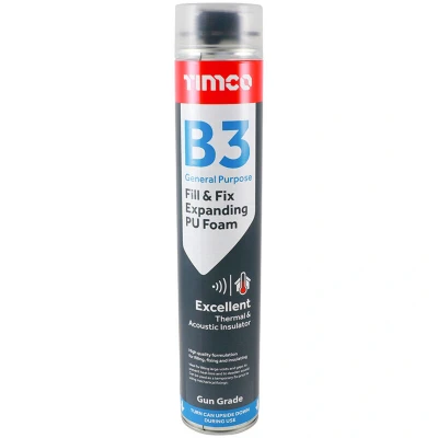 General description TIMCO B3 general purpose fill & fix expanding foam is a high-quality polyurethane-based expanding foam designed to provide excellent thermal and acoustic characteristics. It expands up to 30 times its original volume, dries quickly, and can be sawn, sanded, and painted. Technical specifications Volume: 750 ml Expansion: Up to 30 times its original volume