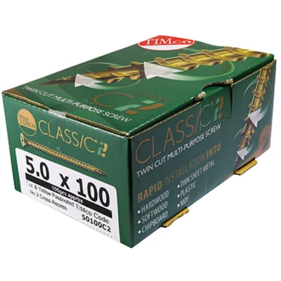 General description The TIMco Classic C2 Wood Screw is a high-performance multi-purpose screw that has been re-engineered for enhanced functionality. It features modern manufacturing methods and design techniques, making it one of Europe’s best-selling screws. Technical specifications Size: 6.0 x 90mm Colour/Plating: Zinc & Yellow Passivated Type: High Performance Multi-Purpose Screw Usage Designed for secure fixing in various applications. Patented twin cut technology allows for rapid "pick-up" and minimizes wood splitting. Deep recess in the C2 head prevents "CAM-OUT" during installation.
