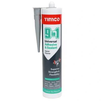 General description TIMCO 9 in 1 Universal Adhesive & Sealant is designed to provide superior bonding and sealing performance for all building materials, even in wet conditions. Its advanced formula makes it extremely versatile, suitable for various applications in construction and home improvement projects. Technical specifications Volume: 290ml Color: Grey