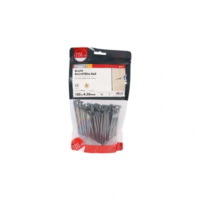 General description Timco Round Wire Nails are designed for general use, featuring a full round head that provides excellent clamping ability. These bright nails are self-colored and do not have any plating, ensuring a clean and natural finish. Technical specifications Size: 100 x 4.50 mm Type: Round wire nails Head: Full round head Finish: Bright (self-colored, no plating)