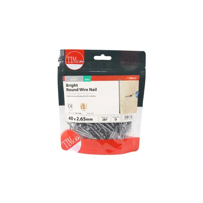 General description Timco Round Wire Nails are designed for general use, featuring a full round head that provides excellent clamping capability. These bright nails are self-coloured and do not have any plating, ensuring a clean and natural finish. Technical specifications Dimensions: 40 mm x 2.65 mm Type: Round Wire Nails Finish: Bright (self-coloured, no plating)