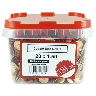 General description Timco Disc Rivets are designed for fixing fibre cement slates, providing a reliable and durable solution for various applications. Technical specifications Material: Copper Size: 20 x 1.50 mm Pack size: 1000 Tub Other information Provides high levels of rust protection.