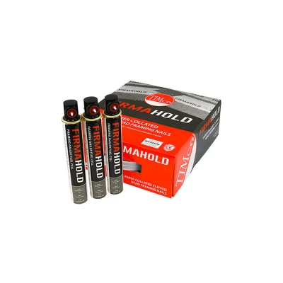 General description For use in structural applications, TIMCO FirmaHold Collated Clipped Head Ring Shank Hot Dipped Galvanised Nails & Fuel Cells are designed with high-quality paper collation to reduce nail jams. Technical specifications Dimensions: 2.8 x 50 mm Type: Ring shank Coating: Hot dipped galvanised Other information Rust protection complies with building regulations and meets service classes.