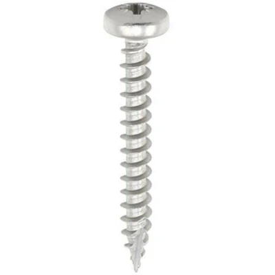 General description Timco 4.0 x 25mm Classic Stainless Steel Pan Head Wood Screws are designed for superior performance and durability. Manufactured from A2 Stainless Steel, these screws are ideal for applications requiring ultimate corrosion resistance, particularly in softwoods, hardwoods (when pre-drilled), chipboard, MDF, and plastic. They are especially suitable for use in corrosive environments or with materials that have inherent corrosive characteristics, such as Green Oak. Technical specifications Size (mm): 4.0 x 25 Size (imperial): 8 x 1 Driver Bit Size: PZ2 Pack Type: Box Pack Quantity: 200 Recess Type: Pozi Head Type: Pan Thread Type: Single Coarse Point Type: 25° Sharp Material: Austenitic Stainless Steel (A2-304) Corrosion Rating (1-5): 4 (suitable for urban & industrial areas with a moderate salt atmosphere) Substrates: Hardwood, Softwood, Chipboard, MDF, Plastic, Thin Sheet Metal, Corrosive Wood (e.g. Oak, Cedar) Salt Spray Resistance (Hrs): Tested to BS EN 9227