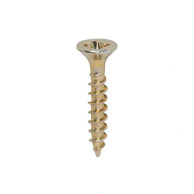 General description Specifically designed as a multi-purpose product, the TIMCO Classic Multi-Purpose Countersunk Gold Woodscrews are ideal for use in hardwood, chipboard, MDF, plastic, and thin sheet metal. The screws feature a 25° sharp point and a special thread design that ensures efficient performance. Technical specifications Dimensions: 3.5 x 20 mm Point type: 25° sharp point Thread design: Special thread for enhanced grip Coating: Corrosion resistant plating
