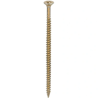 General description Specifically designed as a multi-purpose product, the TIMCO Classic Multi-Purpose Countersunk Gold Woodscrews feature a 25° sharp point and a special thread design. The lubrication and corrosion-resistant plating ensure consistent and efficient performance in various materials including hardwood, chipboard, MDF, plastic, and thin sheet metal. Technical specifications Size: 4.0 x 80 mm Point type: 25° sharp point Thread design: Special thread design Coating: Corrosion-resistant plating