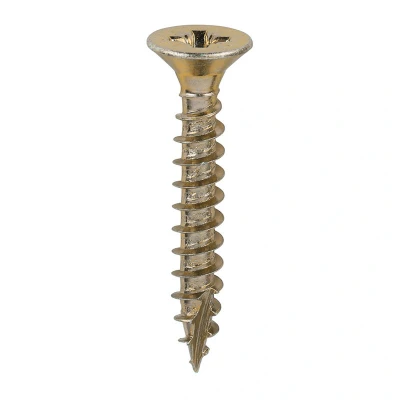 General description Specifically designed as a multi-purpose product, the TIMCO Classic Multi-Purpose Countersunk Gold Woodscrews are ideal for use in hardwood, chipboard, MDF, plastic, and thin sheet metal. The screws feature a 25° sharp point and a special thread design that ensures efficient performance. Technical specifications Dimensions: 6.0 x 40 mm Thread design: Special thread for enhanced grip Point type: 25° sharp point Coating: Corrosion resistant plating