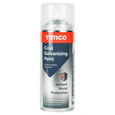 General description TIMCO Cold Galvanising Paint is a premium quality zinc spray that provides excellent corrosion resistance, suitable for use as either a primer or topcoat on metals after processes such as grinding, welding, cutting, and drilling. It is ideal for threaded fasteners, exposed metal edges, and welds. Technical specifications Volume: 380ml