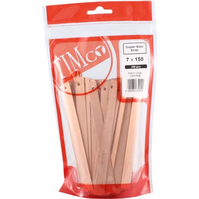 General description Timco Slate Straps are designed for securing slates and shingles, ensuring a reliable and durable installation. Technical specifications Dimensions: 150 x 13 mm Quantity: 100 straps per bag Material: Copper Other information Provides high levels of rust protection.