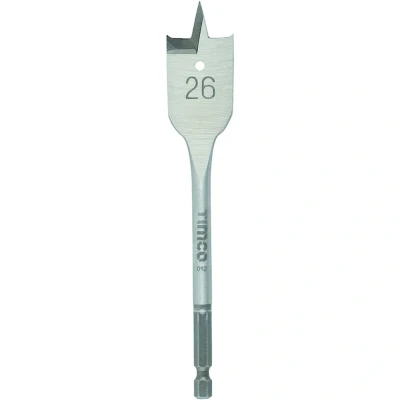 General description The TIMCO Flat Wood Bits are designed for efficient drilling in various types of timber and man-made boards. Featuring a twin cutting edge and an integral center point, these bits enhance drilling speed and facilitate rapid chip removal. Technical specifications Size: 26.0 mm x 152 mm