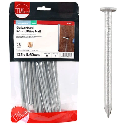General description Timco Galvanised Round Wire Nails are designed for creating a strong bond between pieces of wood, making them ideal for rough carpentry projects where the nails will not be visible in the finished product. These nails are also suitable for clamping applications. Technical specifications Dimensions: 125 x 5.60 mm Weight: 500 g Medium duty rust protection Complies with Service Class 2 Complies with Eurocode 5 Other information Available in various sizes: 40 x 2.65 mm, 50 x 2.65 mm, 65 x 2.65 mm, 65 x 3.35 mm, 75 x 3.75 mm, 100 x 4.50 mm, 125 x 5.60 mm, 150 x 6.00 mm Available in different pack sizes: 1 kg, 2.5 kg, 25 kg