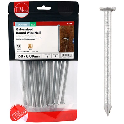 General description Timco Galvanised Round Wire Nails are designed for creating a strong bond between pieces of wood, making them ideal for rough carpentry where the nails will not be visible. These nails are suitable for medium duty rust protection and are perfect for clamping applications. Technical specifications Dimensions: 150 x 6.00 mm Weight: 500 g Service Class: Complies with Service Class 2 Eurocode: Complies with Eurocode 5