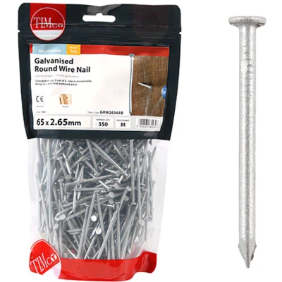 General description Timco Galvanised Round Wire Nails are designed for creating a strong bond between pieces of wood, ensuring that the nails remain hidden in finished rough carpentry projects. These nails are ideal for clamping and provide medium duty rust protection. Technical specifications Dimensions: 65 x 2.65 mm Weight: 1 kg Service Class: Complies with Service Class 2 Eurocode: Complies with Eurocode 5 Other information Available in various sizes: 40 x 2.65 mm, 50 x 2.65 mm, 65 x 3.35 mm, 75 x 3.75 mm, 100 x 4.50 mm, 125 x 5.60 mm, 150 x 6.00 mm Available in different pack sizes: 0.5 kg, 2.5 kg, 25 kg