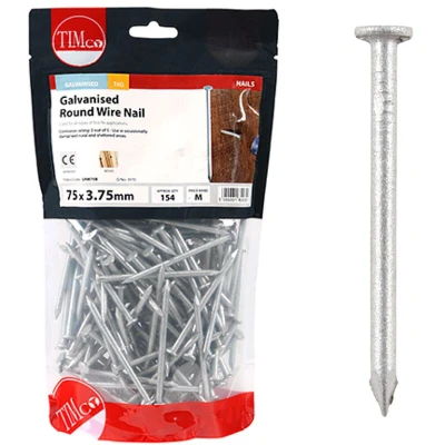 General description Timco Galvanised Round Wire Nails are designed for creating a strong bond between pieces of wood, ensuring that the nails remain hidden in finished rough carpentry projects. These nails are ideal for clamping and provide medium-duty rust protection. Technical specifications Dimensions: 75 x 3.75 mm Weight: 1 kg Service Class: Complies with Service Class 2 Eurocode: Complies with Eurocode 5 Other information Available in various sizes: 40 x 2.65 mm, 50 x 2.65 mm, 65 x 2.65 mm, 65 x 3.35 mm, 100 x 4.50 mm, 125 x 5.60 mm, 150 x 6.00 mm Available in different pack sizes: 0.5 kg, 2.5 kg, 25 kg