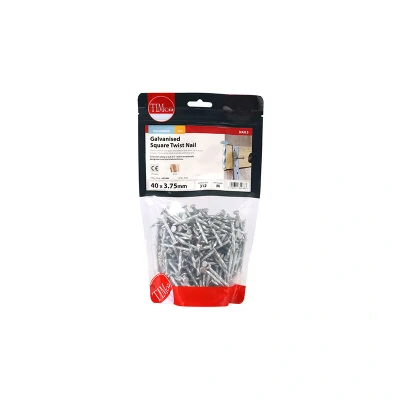 General description The TIMCO Square Twist Nails are designed for use with all types of builders' metal work. Their twisted shank provides enhanced pull-out resistance, making them a reliable choice for various construction applications. Technical specifications Dimensions: 40 mm x 3.75 mm Material: Galvanised steel