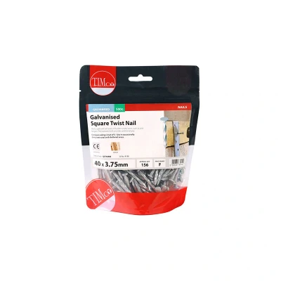 General description The TIMCO Square Twist Nails are designed for use with all types of builders' metal work. Their twisted shank provides enhanced pull-out resistance, making them a reliable choice for various construction applications. Technical specifications Dimensions: 40 mm x 3.75 mm Material: Galvanised steel