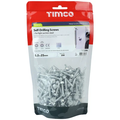 General description Hex head self-drilling screws designed for joining roofing sheets to light section steel (maximum thickness of 5.0mm) without the need for pre-drilling. These screws are ideal for exterior applications, providing a secure and efficient fastening solution. Technical specifications Type: Self-drilling screws Head type: Hex head Dimensions: 5.5 x 25 mm Maximum steel thickness: 5.0 mm