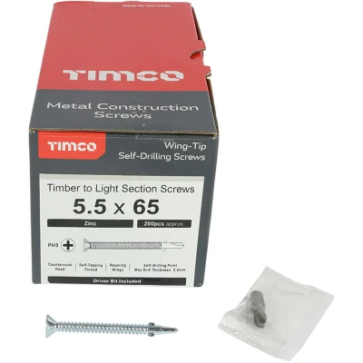General description The TIMco Wing Tip light section screw is engineered for securely attaching wood to light section steel, with a maximum thickness of 5mm. Its innovative design features a coarse self-tapping thread with wings that ream out the timber, allowing the screw to achieve maximum revolutions per minute (R.P.M.) without overheating. Upon contact with metal, the wings break off, enabling the thread to self-tap into the metal for a strong hold. Technical specifications Size: 5.5 x 65mm Box Quantity: 200 Colour/Plating: Zinc Head Type: Phillips Countersunk Bit Size: PH3 Other information Bright zinc electrolytic plating with a clear toxin-free finish.