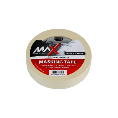 General description Trade quality, general purpose masking tape manufactured from saturated semi-crepe paper with pressure sensitive natural rubber adhesive. Made in Europe. Technical specifications Length: 50m Width: 25mm