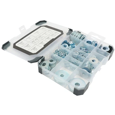 General description A wide selection of zinc plated and clear passivated steel washers, available in three types to suit a wide range of applications. Technical specifications Material: Zinc plated and clear passivated steel Quantity: 291 pieces