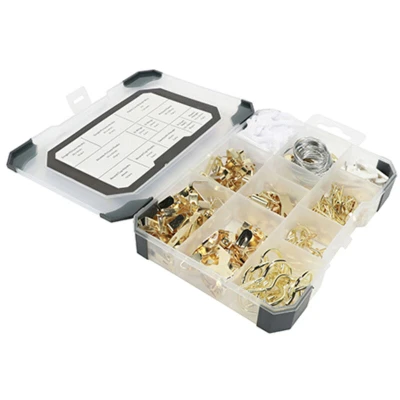 General description Timco Picture Hanging Kit includes a comprehensive selection of 179 pieces designed for securely hanging pictures and artwork. This kit features brass plated picture plates, hangers, D-rings, picture nails, sawtooth brackets, and hooks, ensuring you have everything needed for various hanging needs. Technical specifications Includes 179 pieces Brass plated picture plates Hangers D-rings Picture nails Sawtooth brackets Hooks Nylon line Steel hanging wire