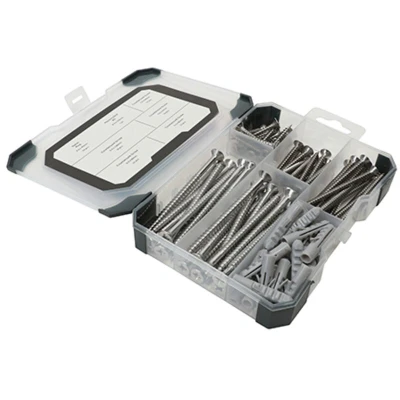 General description A selection of countersunk, stainless steel woodscrews with nylon plugs for fixing to masonry. Technical specifications Material: A2 Stainless Steel Includes: 91 pieces Drill bit size: 8mm
