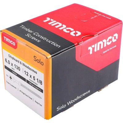 General description TIMco Solo woodscrews are designed for versatility, primarily used in various types of timber, man-made boards, and masonry with a plastic plug. Their special thread configuration ensures ultimate performance and high pull-out resistance, making them ideal for a range of applications. Technical specifications Size: 6.0 x 130mm Thread Design: Single thread Fully threaded up to: 70mm Point Type: 25° Sharp Point Plating Options: Zinc & Yellow or Zinc & Clear Cross recess double countersink available in both plating types