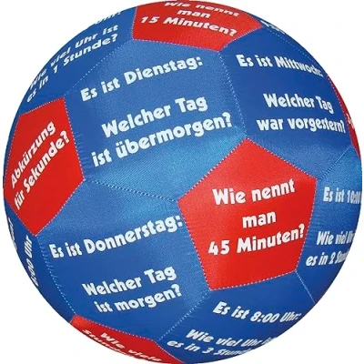 Educational game ball "Pello" | Our educational game ball "Pello" is more than just a toy. It is made of durable materials and printed with time-related questions. So as a game, the questions can be answered yourself or asked to other children. Play, move and learn: the educational game balls are lightweight and ideal for catching and throwing games. Children throw the ball in turn and solve tasks depending on the field the thumb points to when catching. Versatile learning games: whether outdoors, at school or at home - the educational game ball "Pello" can be used in many ways. The way to play also stimulates the imagination again and again, because the rules are left to everyone themselves Various themes: our educational game ball "Pello" is available in many designs with different themes. From images to expand vocabulary to maths tasks or even a question ball in English or French. About us: TimeTEX is a family-run company in Germany. Our company motto is "Do not talk, but act", which is why we are strongly committed to the environment and integration. This care for people and the environment is also reflected in the quality of our products.