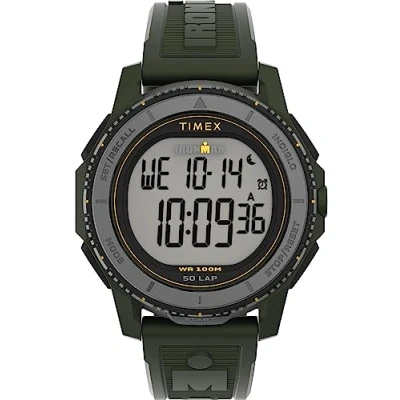 Round black 46.5mm resin case with acrylic crystal completed with green polyurethane strap and buckle Quartz digital dial display with date Men's Quartz Analog 3-hand, Date with Indiglo night-light Water resistant to 50m (165ft) in general, suitable for short periods of recreational swimming, but not diving or snorkeling Chronograph watch with Indiglo Night-Light. Timer and alar.