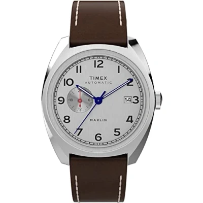 This Timex Marlin Sub-dial Automatic Multi Dial Watch for Men is the perfect timepiece to wear or to gift. It's Silver 38 mm Round case combined with the comfortable Brown Leather watch band will ensure you enjoy this stunning timepiece without any compromise. Operated by a high quality Automatic movement and water resistant to 5 bars, your watch will keep ticking. This classic Automatic watch gives a comfortable feeling with its Leather strap, it's perfect for every occasion -The Multi Dial watch has a calendar function: Date, 24-hour Display and Luminous Hands High quality 21 cm length and 20 mm width Brown Leather strap with a Buckle Case diameter: 38 mm,case thickness: 15 mm, case colour: Silver and dial colour: Silver