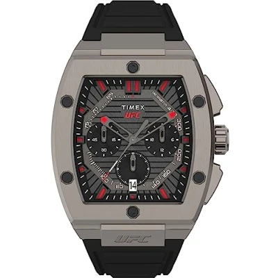 Featuring a traditional Tonneau-shaped stainless-steel case and bezel, the UFC Beast has a strong and modern design that is perfect for athletes and fans alike. This Chronograph watch has a calendar function: Date, Stop Watch, 24-hour Display and Tachymeter High quality 21 cm length and 25 mm width Black Silicone strap with a Buckle Case measurement: 42 X 51 mm,case thickness: 12 mm, case colour: Gun and dial colour: Black Water resistant: 5 bars -Weight: 119 g The watch is delivered in an original gift box and has a warranty of 2 years