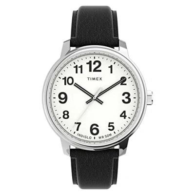 Round silver-tone 43mm brass case with mineral glass crystal, completed with a black leather strap and buckle clasp White analogue display, easy to read, featuring full arabic numerals Quartz mouvement with three hands display INDIGLO Light Up Watch Dial Water resistant to 30m (98 ft in general, suitable for short periods of recreational swimming, but not diving or snorkeling) The direct descendant of our 1960's televised torture test survivors, today's Easy Reader is as durable as it is classically cool.