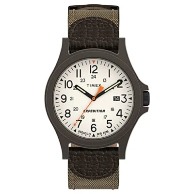 Matte brown 40mm case, completed with a two-piece brown fabric strap with buckle clasp Cream analogue display, easy to read, featuring full arabic numerals INDIGLO Light Up Watch Dial and luminous hands Quartz movement with 3 hands Water resistant to 50m (165ft) ): in general, suitable for short periods of recreational swimming, but not diving or snorkeling